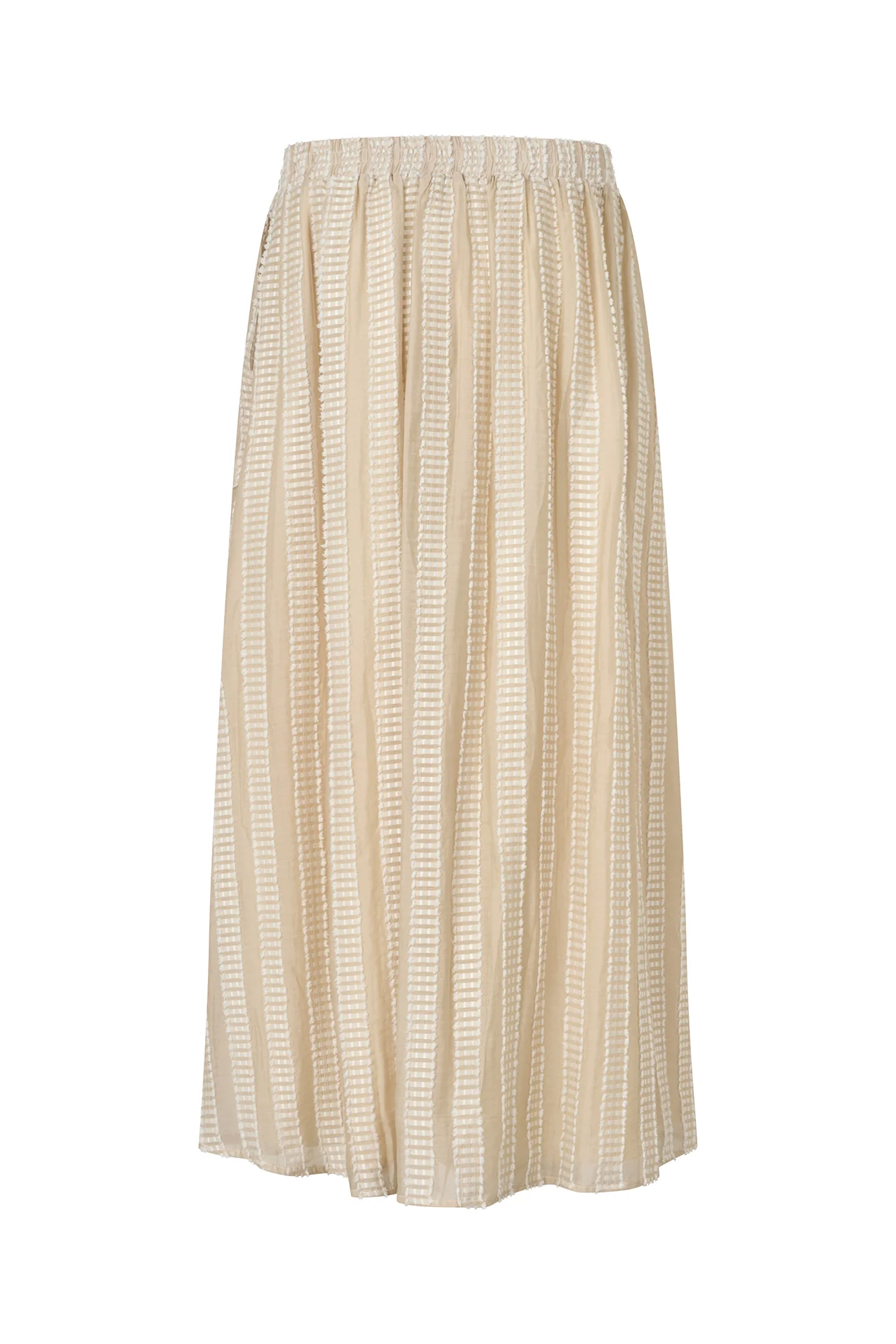 The beautiful AkaneLL skirt is a versatile piece that is both elegant and relaxed. With its light and airy structure, and the tone-on-tone vertical stripes, the skirt exudes a sophisticated yet minimalist look. The elastic waistband makes it both comfortable and easy to style, while the loose, A-line silhouette offers freedom of movement and a flattering drape. The textured stripes add a refined touch, making the skirt an ideal choice for both everyday wear and more formal occasions. It can be styled with a simple top or shirt for an elegant and casual look, and paired with our Rora shirt, you achieve a complete dress look. Wear it with sandals in the summer or with boots and a knit in the cooler months for a timeless, well-rounded outfit. It comes in cream/white or black/white.