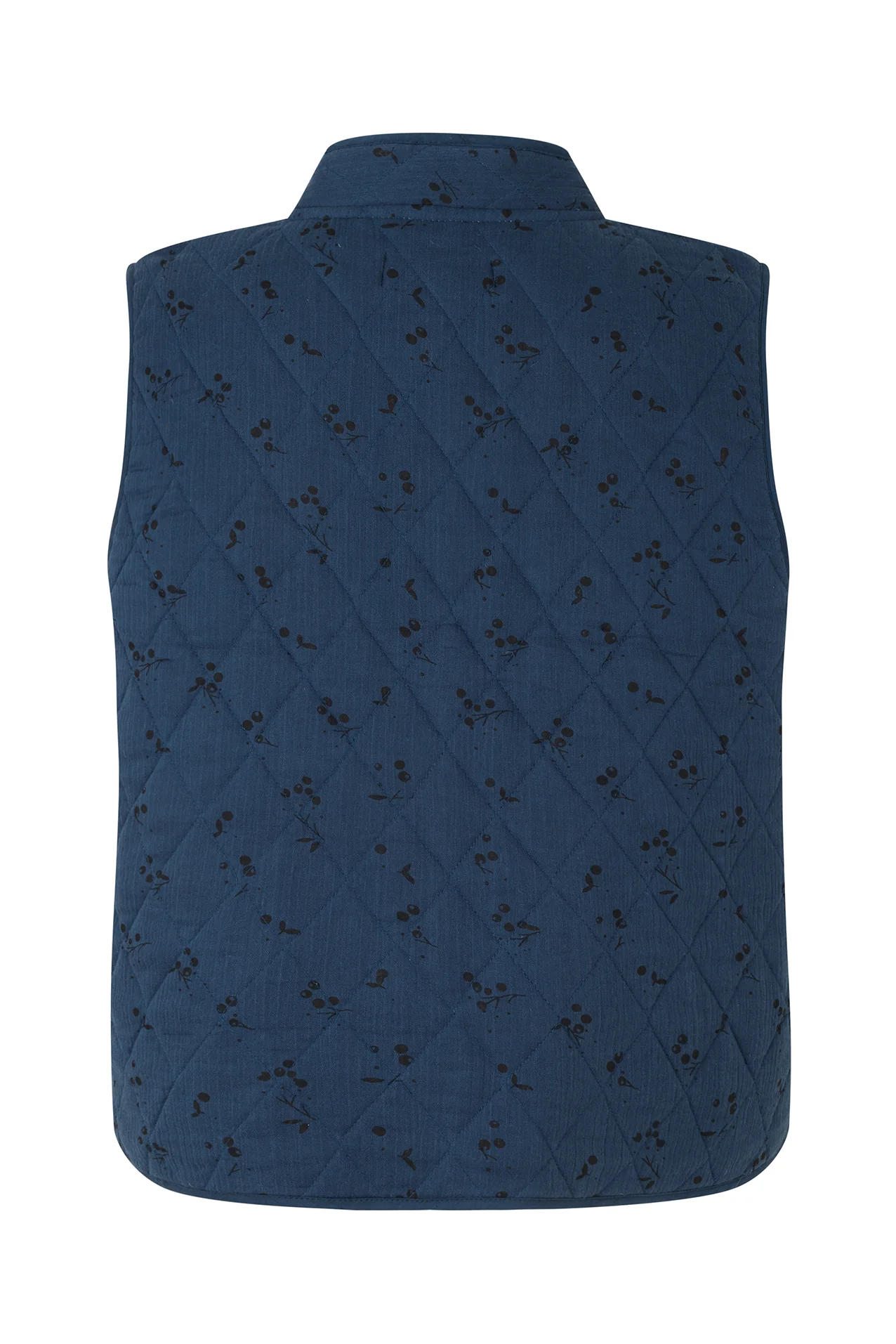 The CairoLL vest is a stylish and functional quilted vest. It is lightly padded and made from 100% cotton. With large, round buttons, it has a timeless design that also adds a modern touch to any outfit. It features a round neckline with a stand-up collar, front pockets, and is crafted in a unique black floral pattern on a deep blue background. The CairoLL vest is charming, and during the warmer months, you can wear it on its own, but it is also fantastic when paired with a simple T-shirt, a classic shirt, or layered over dresses.