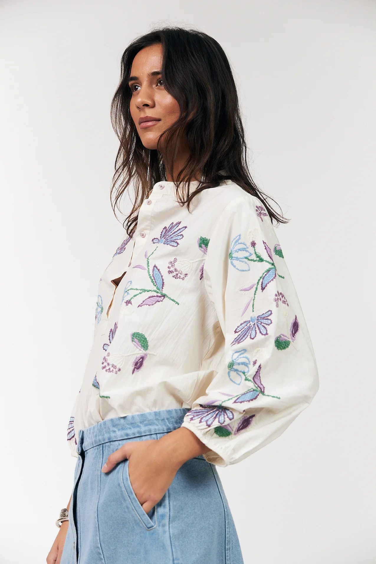 • Feminine shirt with embroidered flowers on the front and sleeves
