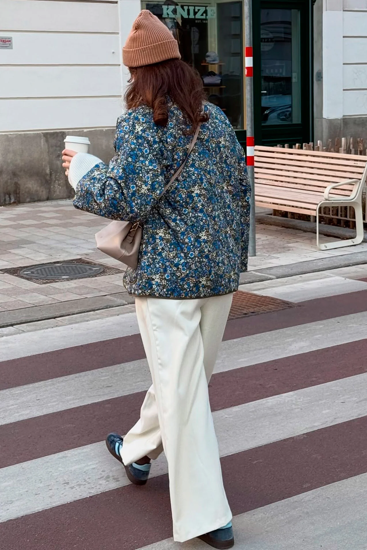 Our LuluLL jacket is designed in a lightly padded, quilted quality. The jacket features an oversized fit, drop-down shoulders, and long sleeves, an open front, and large front pockets. It is ideal for adding a personal touch to your basic outfit, and the beautiful small-flowered fabric is soft and comfortable. The LuluLL jacket is not just a fashionable choice for indoor wear during the colder months, but also perfect as a transitional jacket when spring arrives. It will undoubtedly become a favorite in your wardrobe that you will turn to time and time again. Please note the style runs rather big in size, if you are unsure what size to choose, we would recommend to go with the smaller choice.
