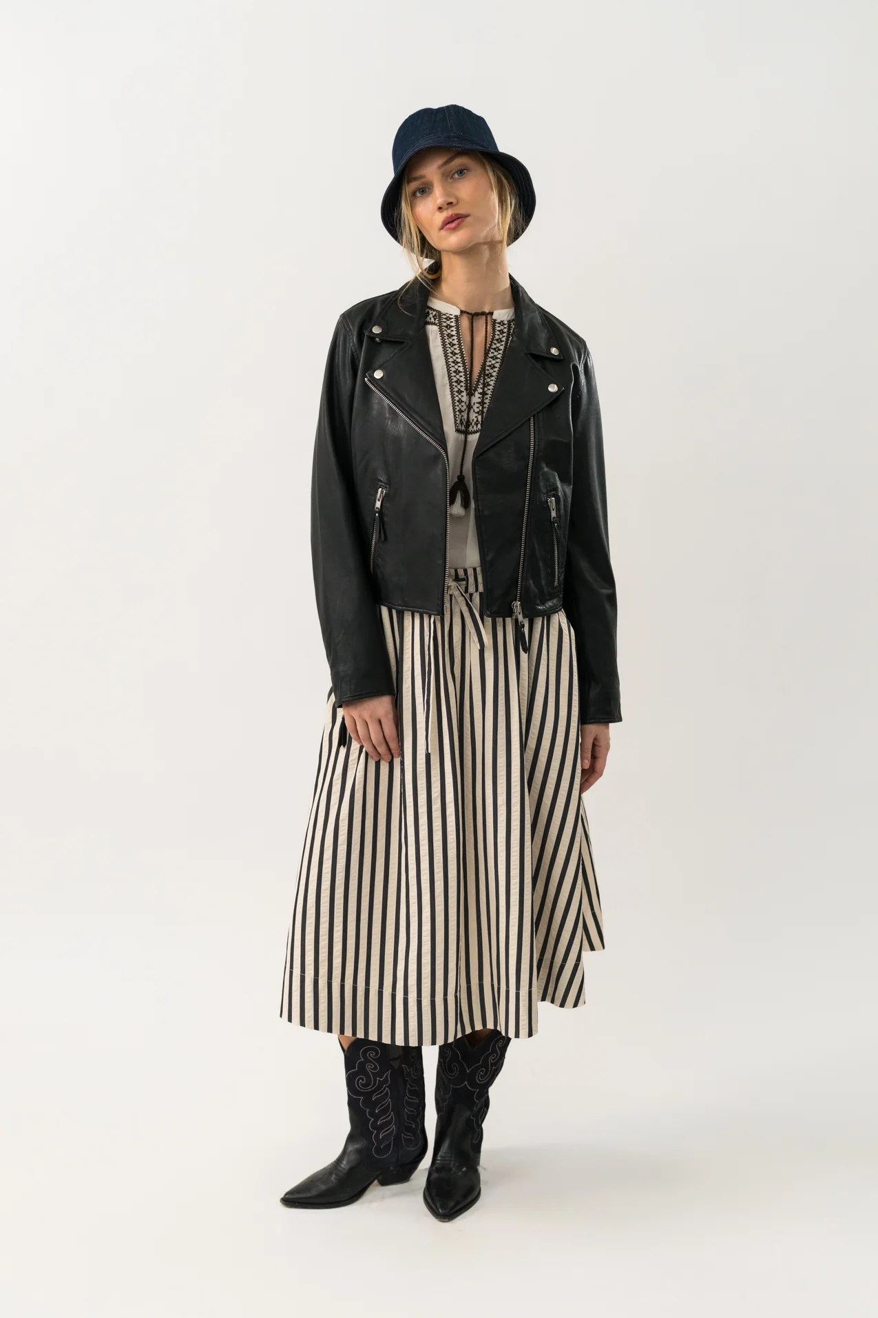 MadisonLL is the ultimate biker jacket, designed in soft black lamb leather for a raw yet luxurious look. It features a short fit, sharp details, and a cool attitude.