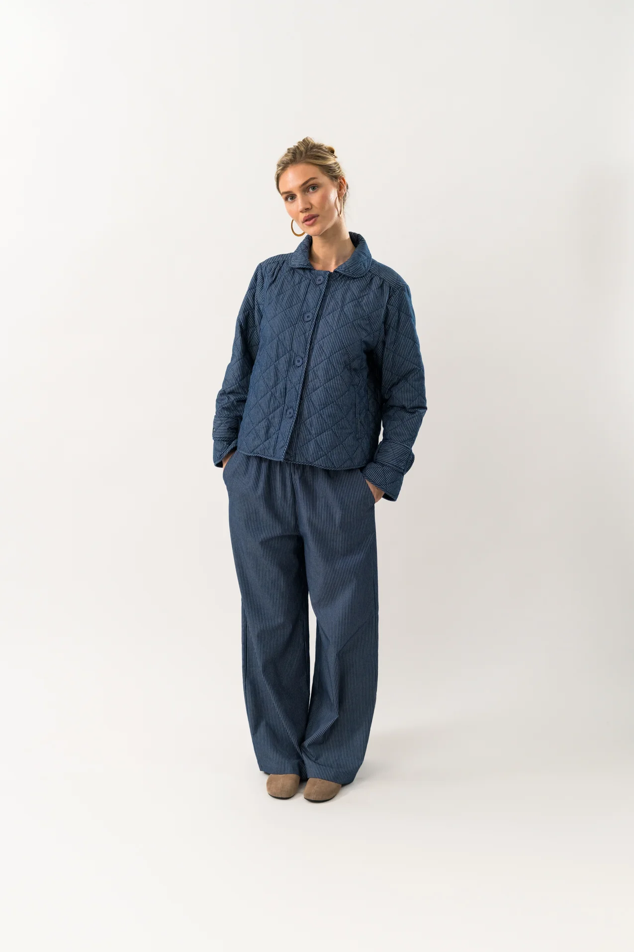 The ViolaLL jacket feels both lightweight and exclusive. It is elegant and timeless, and in this version, it comes in Dark Blue with narrow white stripes. With its classic cut and delicate details, it is a perfect choice for both everyday wear and more sophisticated looks.